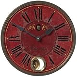 Handsomely framed in a lovely cast brass, this Villa Tesio clock is a welcomed addition to any home or office. A weathered laminate red clock face with black roman numerals at every hour bring a lovely contrast to the room. The inner pendulum surrounded by cast brass detailing and classic metal spaded hands give it an antique quality. Weather laminate construction. Red and black color. Cast brass details. Takes one AA battery (not included). 11" wide.
